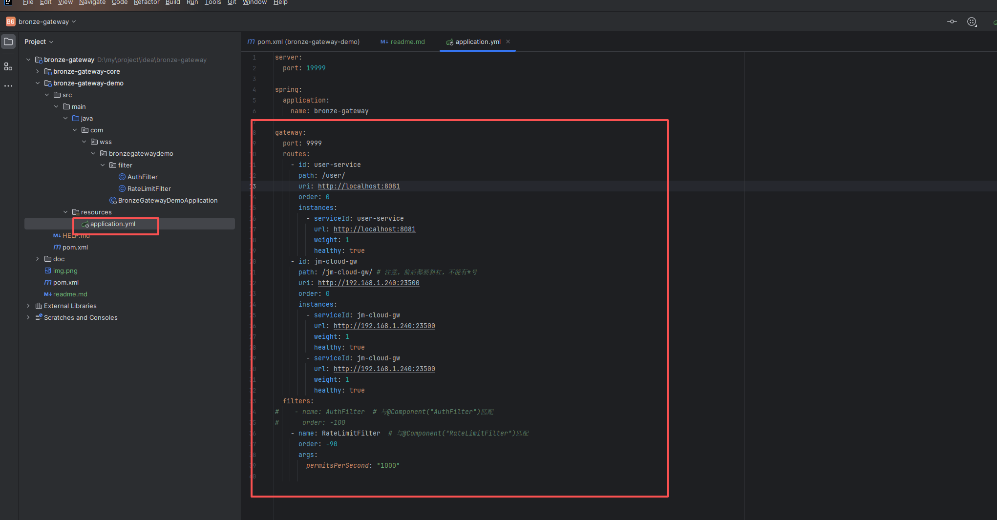 会根据yml配置。匹配:jm-cloud-gw 代理到实例:jm-cloud-gw,并代理到地址 http://192.168.1.240:23500,完整代理后地址: http://192.168.1.240:23500/admin/tenant/getTenantById/2?a=111