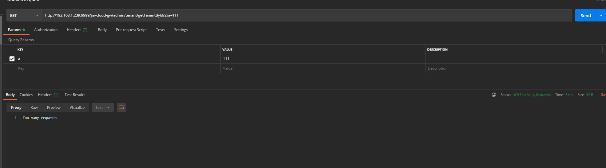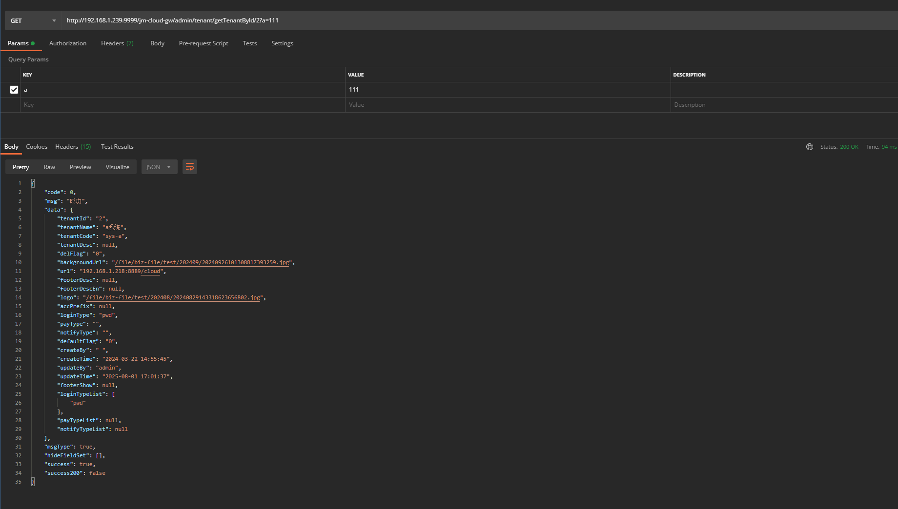 请求地址:http://192.168.1.239:9999/jm-cloud-gw/admin/tenant/getTenantById/2?a=111