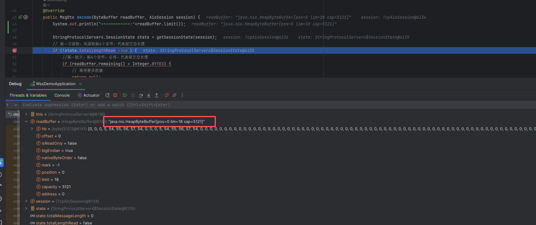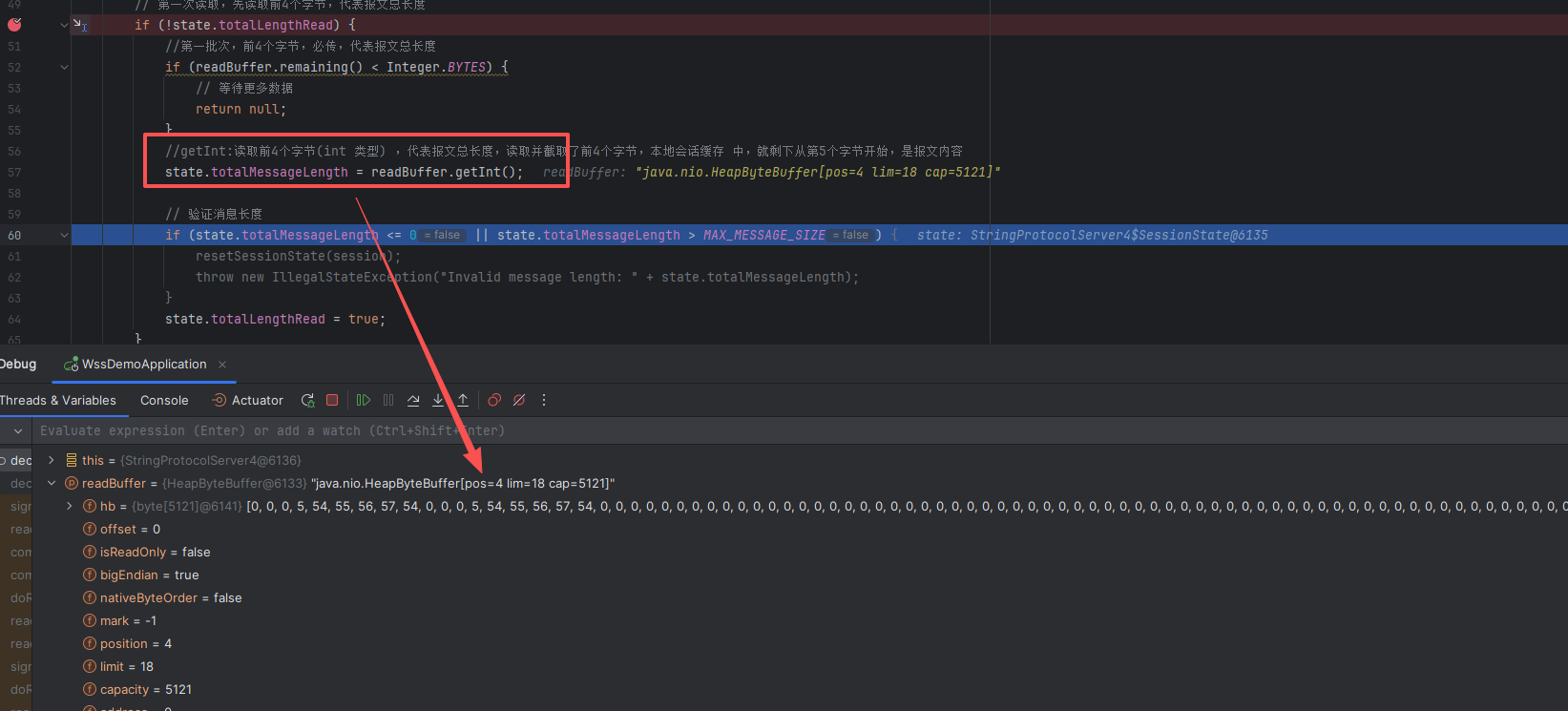 remaining():获取剩余可读字节数。mark():标记当前位置。getInt():从当前位置读取一个int(4字节),然后位置递增4。get(byte[] dst):从缓冲区读取字节到指定数组。reset():将位置重置到最近一次标记的位置。flip():将缓冲区从写入模式切换到读取模式。compact():压缩缓冲区,将未读数据移到缓冲区开头,以便后续写入。slice():创建一个共享原缓冲区内容的新缓冲区,用于处理剩余数据。