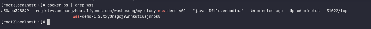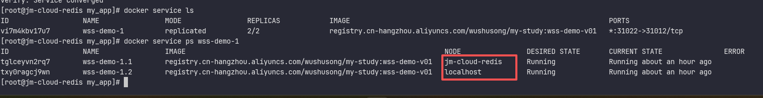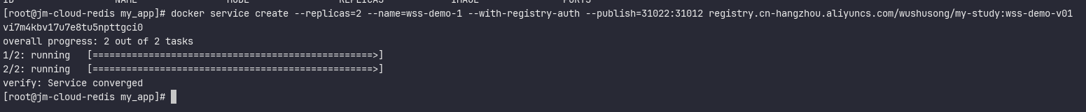 docker service create --replicas=2 --name=wss-demo-1 --with-registry-auth --publish=31022:31012 registry.cn-hangzhou.aliyuncs.com/wushusong/my-study:wss-demo-v01–replicas:表示期望1个服务实例