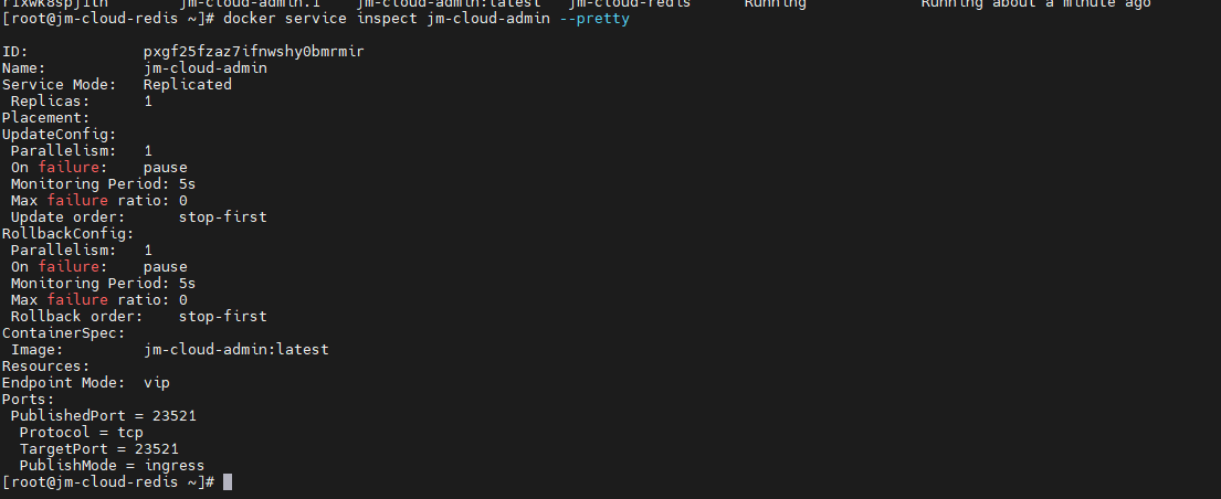 docker service inspect jm-cloud-admin --pretty–pretty:表示以 yaml 格式显示,不加此参数将以 json 格式显示