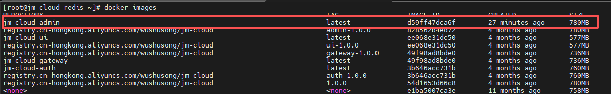 创建好 swarm 集群后,就可以部署服务了(也可以不加入工作节点,直接在管理节点单节点上部署服务),回到管理节点 cnkanon-1,基于 jm-cloud-admin 镜像创建服务: