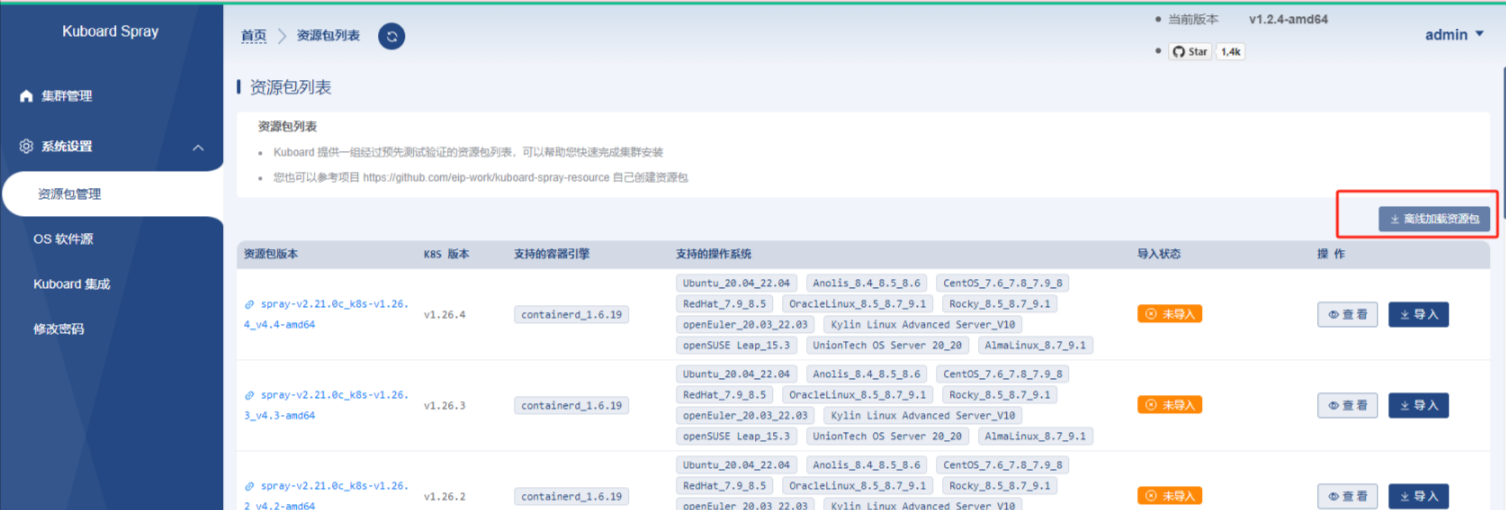 在kuboardSpray界面导航“系统设置”-“资源包管理”中,点击”离线加载资源包“,按界面操作即可完成导入