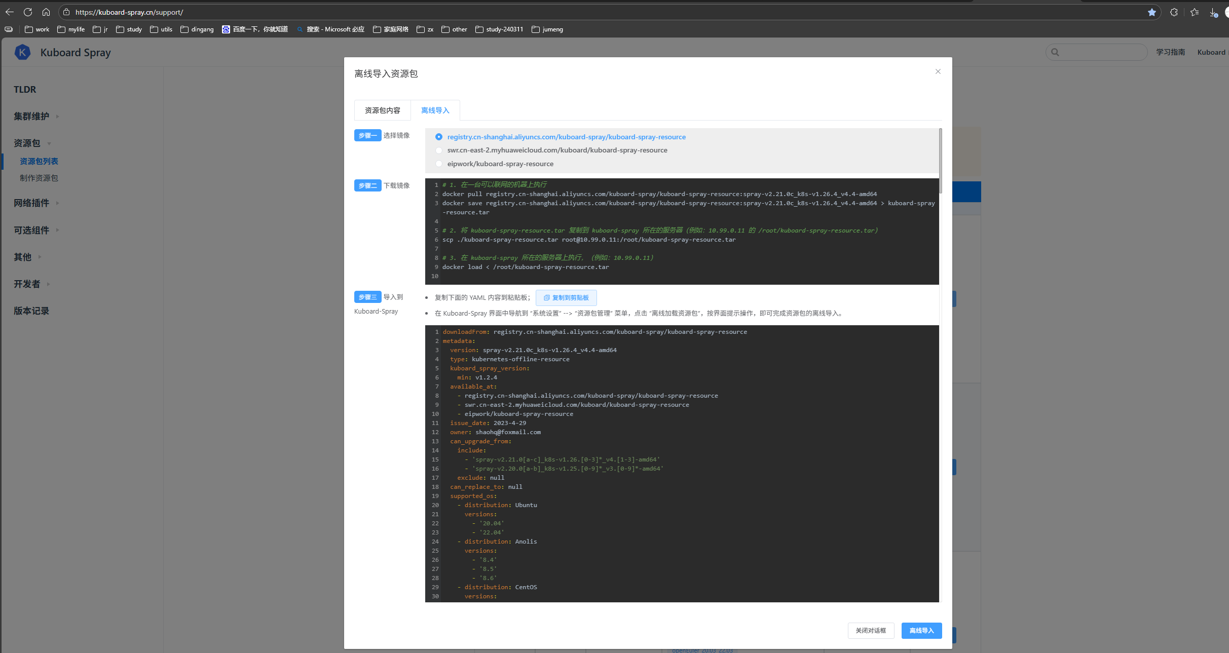 根据步骤,在有网的机器上下载资源包,然后到离线环境的kuboardSpray上上传,并load到docker中即可