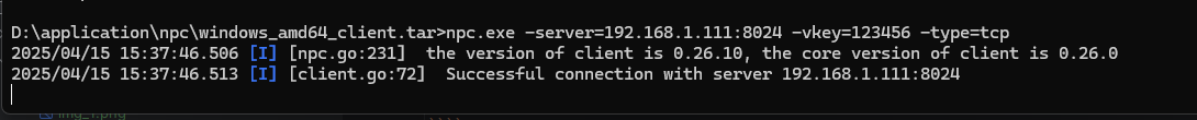 npc.exe -server=192.168.1.111:8024 -vkey=123456 -type=tcp