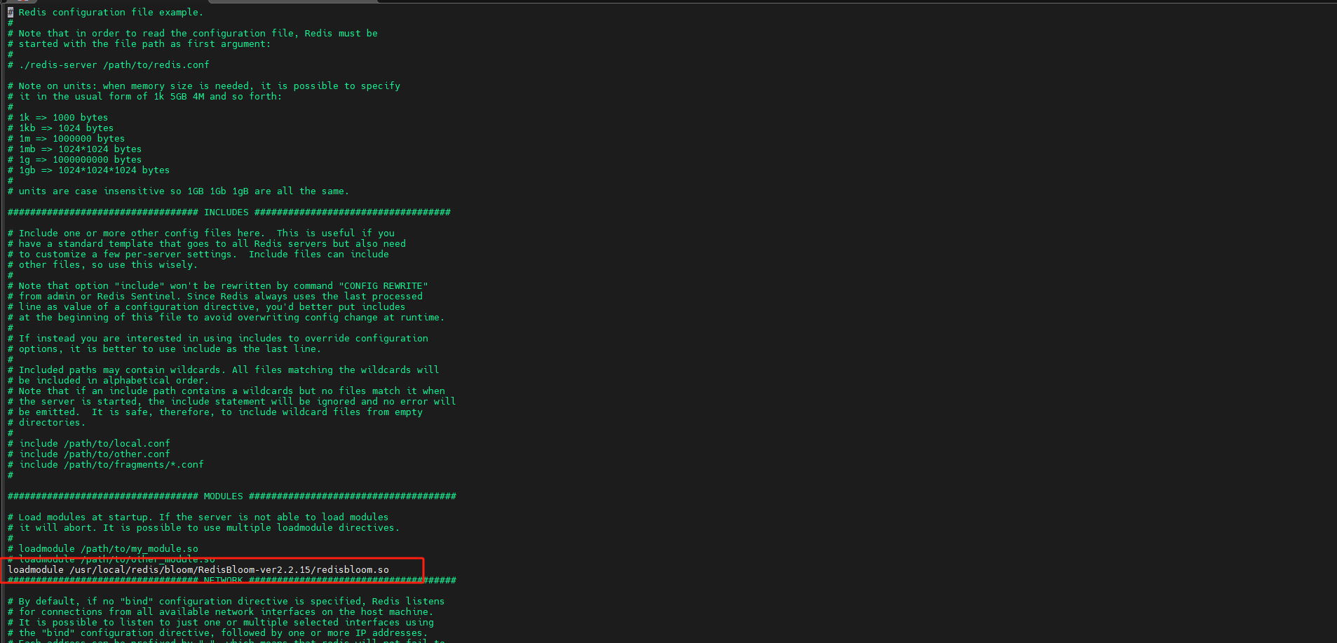 loadmodule /usr/local/redis/bloom/RedisBloom-ver2.2.15/redisbloom.so重启redis即可