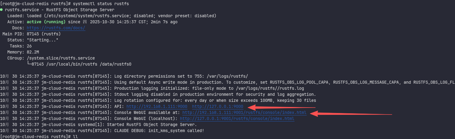 sudo systemctl enable --now rustfssystemctl start rustfs3.2、验证服务状态