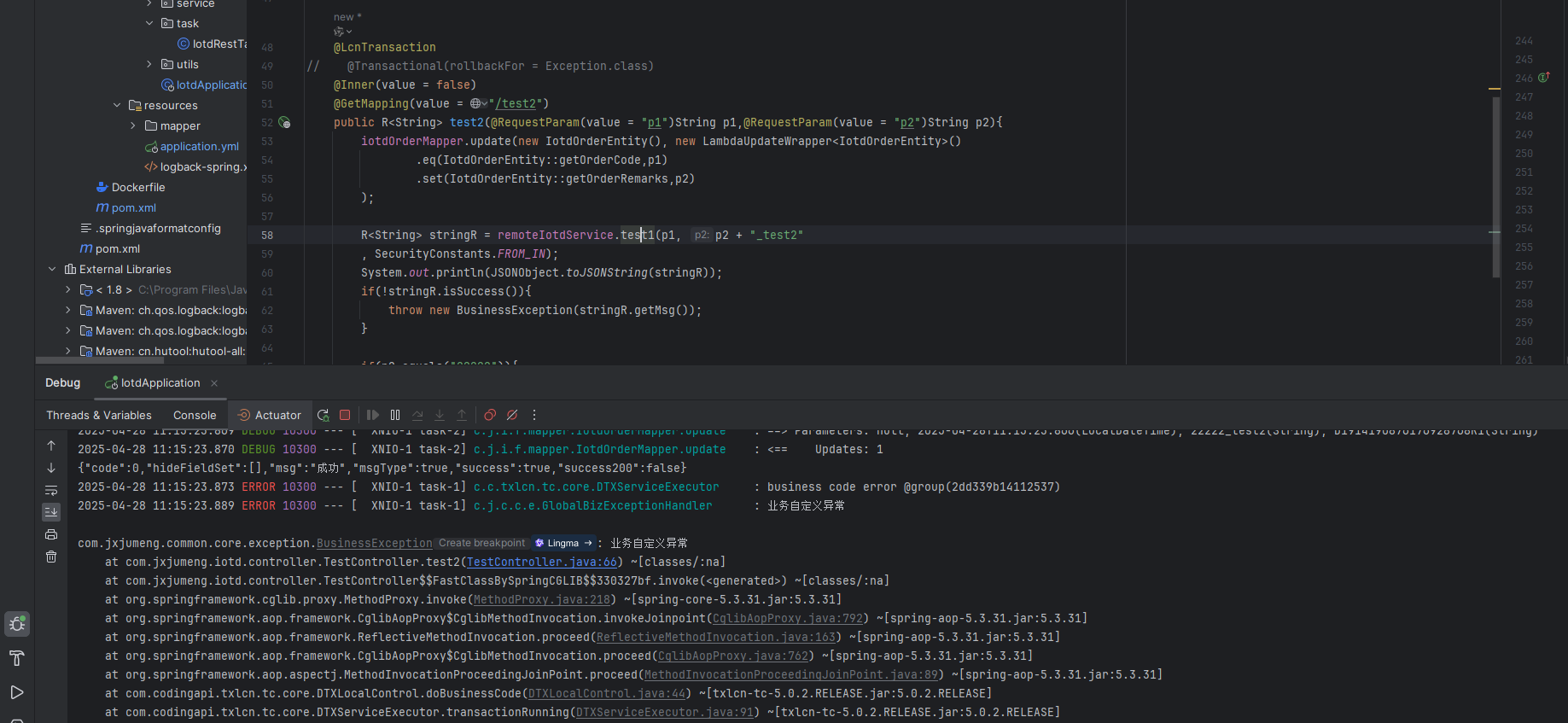2、异常测试,数据回滚:p1=22222 就会触发模拟异常