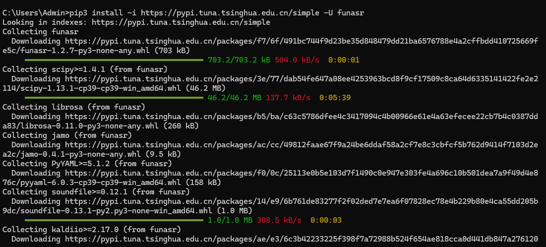 pip3 install -i https://pypi.tuna.tsinghua.edu.cn/simple -U funasr