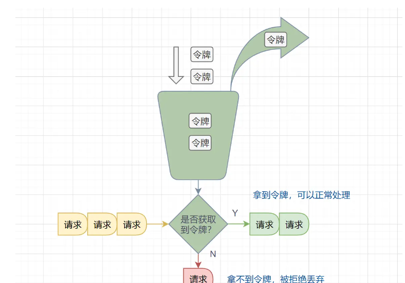 与漏桶算法相反,系统以固定的速率往桶里放入令牌,称为令牌桶,如果有请求需要这个令牌,这可以从桶里拿一个,拿到了令牌即允许放行,直到令牌被拿完即令牌不足,则请求需等待或被丢弃。